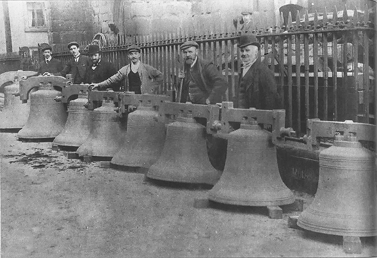 In 1905 during repairs to the tower, it was found that the oak frame from which they hung needed replacing. The photograph shown below shows the bells waiting to be re-hung from a new iron frame. The man on the right is George Cope, town crier and leader of the bell-ringers. He was a wood-turner by trade and made the wood from an old bell frame into an elaborate armchair with a carved back carved by his son Albert. In 1922, after his death, the chair was presented to the parish church.